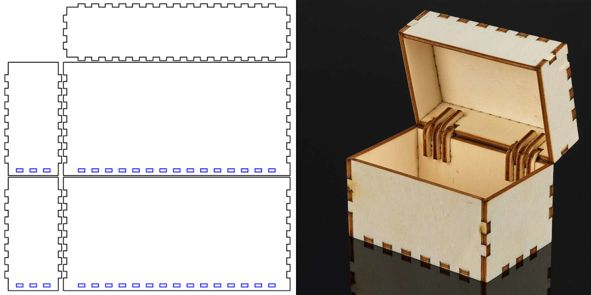 Here you can generate templates for cutting various types of wooden boxes on laser CNC or CNC milling machines.You select the type of a box and set the necessary parameters, for example - length, depth and height.